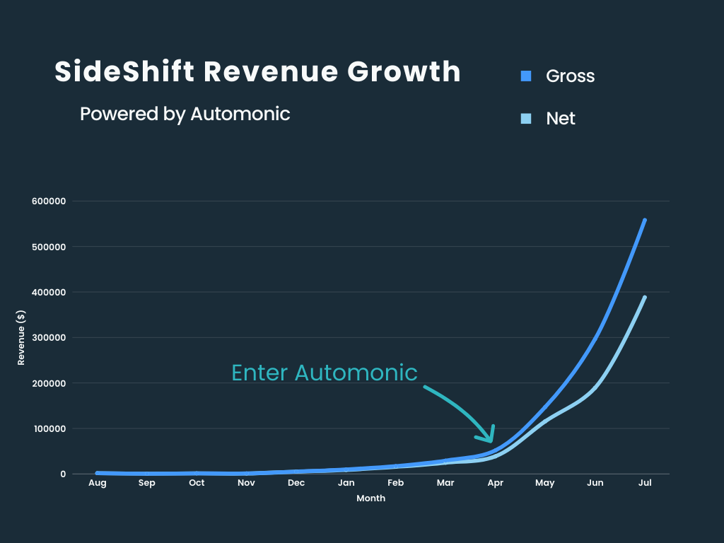 In just three months, SideShift 10x’d from $50k to $550,000+ in gross monthly revenue, retaining over $350,000 in net revenue.